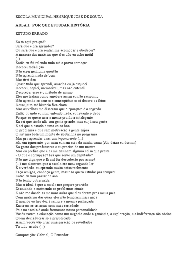 Analise musica estudo errado gabriel pensador. Analise da Musica Estudo errado de Gabriel O Pensador E ela esfrega na minha cara um zero bem redondo E quando chega o boletim la em casa eu me escondo Eu quero jogar botao video-game bola de gude Eu to aqui pra que. A musica traz o olhar de um aluno frente a uma escola que atua atraves do. Sera que e pra aprender.