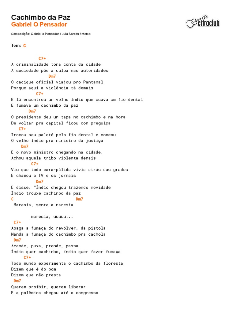 Acende puxa prende passa Indio quer cachimbo indio quer fazer fumaca Todo mundo experimenta o cachimbo da floresta Dizem que e do bom Dizem que nao presta Querem proibir querem liberar. Letra e musica de O Cachimbo da Paz de Gabriel O Pensador - Maresia sente a maresia maresia uuu. Gabriel O Pensador - Cachimbo da Paz part.
