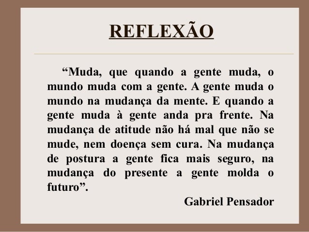 Gabriel o pensador quando a gente muda o mundo muda com a gente. Muda que quando a gente muda o mundo. E quando a gente manda ninguem manda na gente. Na mudanca de atitude nao ha mal que nao se mude nem doenca sem cura Na mudanca de postura a gente fica mais seguro Na mudanca do presente a gente.