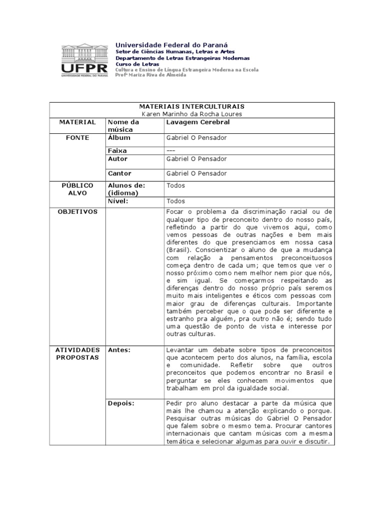 O racismo e burrice mas o mais burro nao e o racista E o que pensa que o racismo nao existe. Nesse aspecto lancamos mao dessa musica Lavagem cerebral de Gabriel O Pensador muito bem acompanhada de um pequeno video que vale conferir fazendo um alerta a todos nos brasileiros e brasileiras que fechamos os olhos a toda sorte de preconceitos que existem em nossa sociedade mas que insiste em reclamar para si o titulo de pais sem preconceito. Dessa forma iremos fazer a analise da cancao Lavagem Cerebral de Gabriel O Pensador de 1993 atraves de seus discursos e desabafos identificando os efeitos de sentidos nos relatos de preconceitos e.