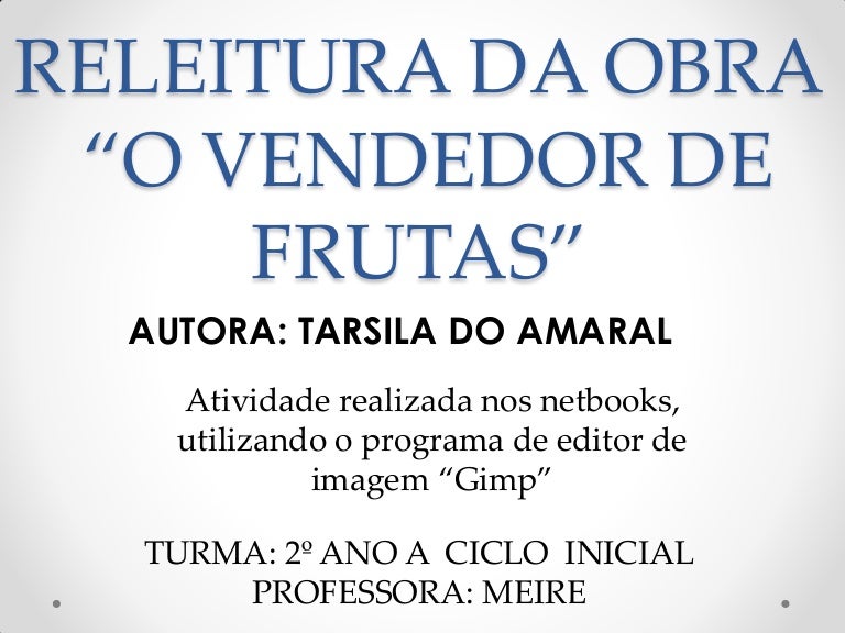 Obra de arte o vendedor de frutas de tarsila do amaral. Misturar foto e arte tambem foi a ideia principal na releitura de uma das obras mais famosas de Tarsila do Amaral na EMEI. Voce vai viajar pelo cenario que inspirou Tarsila do Amaral na pintura de Vendedor de Frutas em 1925. 02 Descreva toda a paisagem usando o maior numero possivel de adjetivos.