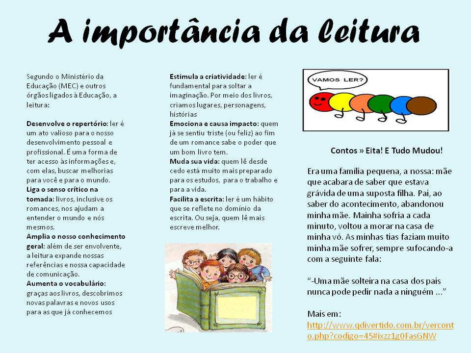 E cliche mas e fato. A importancia da leitura e indiscutivel quando o assunto em pauta e educacao. Ao contrario do que muitas pessoas acreditam ler revistas sites gibis livros de romance entre outras leituras de entretenimento e tao eficaz quanto ler um livro tecnico.